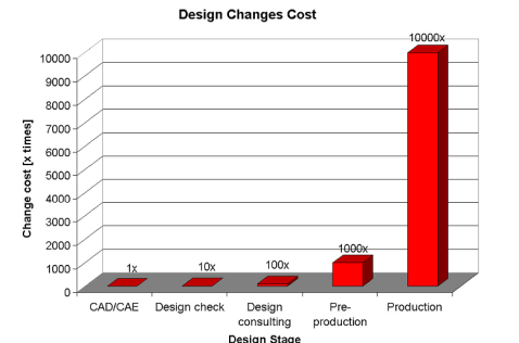 Qualitative expense comparison associated with the part design changes is shown in Figure 4 , showing the fact that when design changes are done at an early stages on the computer screen, the cost associated with is an order of 10.000 times lower than that if the part is in production. These modifications in plastic parts could arise fr om mould modifications, such as gate location, thickness changes, production delays, quality costs, machine setup times, or design change in plastic parts.