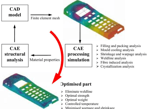 In the plastic injection moulding, the CAD model of the plastic part obtained from commercial 3D programs could be used for the part performance and injection process analyses. With the aid of CEA technology and the use of concurrent engineering methodology, not only the injection mould can be designed and manufactured in a very short of period of time with a minimised cost but also all potential problems which may arise from part design, mould design and processing parameters could be eliminated at the very beginning of the mould design. These two tools help part designers and mould makers to develop a good product with a better delivery and faster tooling with less time and money.