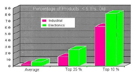 Many company executives now realize how vital it is to deploy new products to market rapidly. New products are the key to corporate prosperity. They drive corporate revenues, market shares, bottom lines and share prices. A company able to launch good quality products with reasonable prices ahead of their competition not only realizes 100% of the market before rival products arrive but also tends to maintain a dominant position for a few years even after competitive products have finally been announced (Smith, 1991). For most products, these two advantages are dramatic. Rapid product development is now a key aspect of competitive success. Figure 2 shows that only 3–7% of the product mix from the average industrial or electronics company is less than 5 years old. For companies in the top quartile, the number increases to 15–25%. For world-class firms, it is 60–80% (Thompson, 1996). The best companies continuously develop new products. At Hewlett-Packard, over 80% of the profits result from products less than 2 years old! (Neel, 1997)